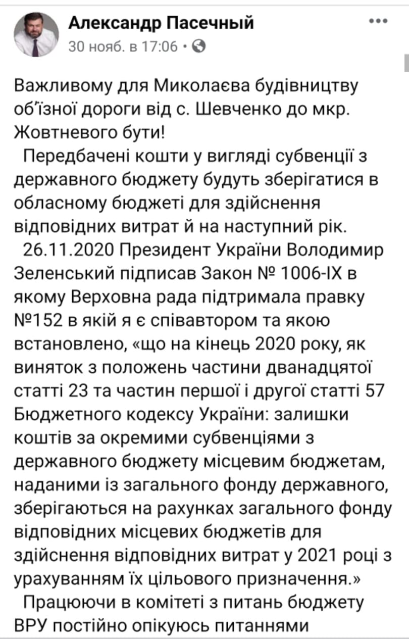 «Важному для Николаева строительству объездной дороги от села Шевченково (Витовского района, — ред) в мкр Октябрьский (Корабельный — ред) быть! Предусмотренные средства в виде субвенции из государственного бюджета будут сохранены в областном бюджете для осуществления соответствующих расходов и в следующем году», — сообщил николаевский нардеп от партии «Слуга народа».