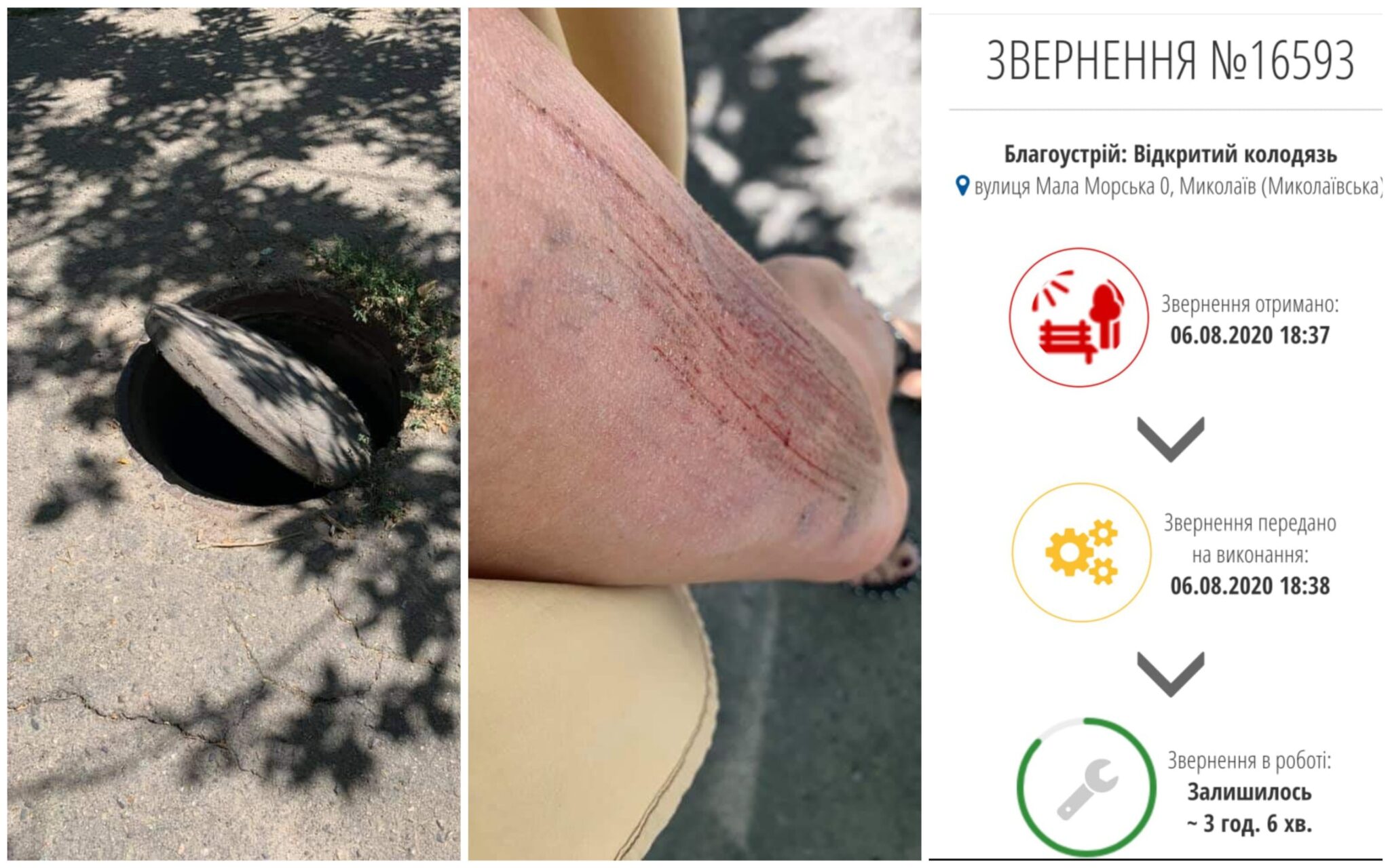 «Я провалилась в люк! Он был закрыт, цвета асфальта, я его просто не заметила! На адреналине смогла выбраться самостоятельно! В следующий раз на моем месте может оказаться ребенок или пожилой человек!», — Леся Галенко направила жалобу в городской Contact Center.