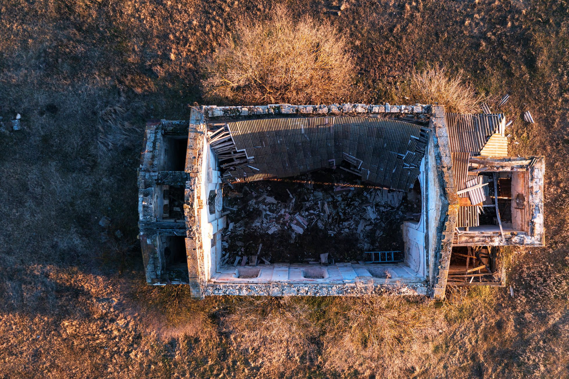 Фото он разместил на своей странице в соцсети. Видим, что разрушений прибавилось. Храм полностью лишен крыши. Это хорошо видно на фото сверху. Отсутствует колокольня.